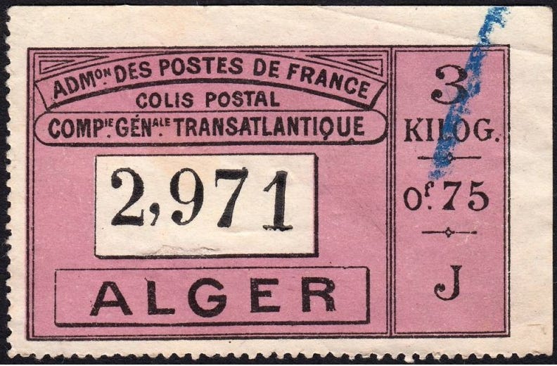 Cette compagnie transportant, pour le compte de l’Administration des Postes, les colis et les lettres, elle créa des vignettes destinées à l’affranchissement des colis. (…) Ces vignettes, dentelées 11, comportent deux parties séparées par un pointillé, l’une carrée 40-40, l’autre oblongue 40-65 et ayant toutes deux la légende : « ADMINISTRATION DES POSTES - COLIS POSTAL - Cie Gle TRANSATLANTIQUE » avec, au centre, un nom de ville et au-dessus, un numéro.