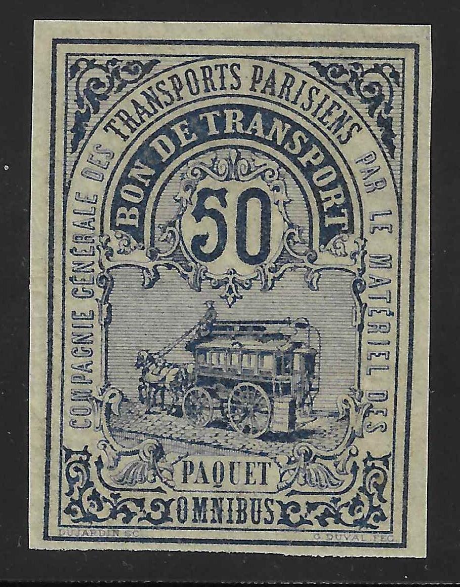 la Compagnie Générale des Transports Parisiens (1878). Au centre, voiture omnibus à deux chevaux surmontée d’un écusson portant le chiffre de la valeur, dans un encadrement formant portique portant « COMPAGNIE GÉNÉRALE DES TRANSPORTS PARISIENS PAR LE MATÉRIEL DES OMNIBUS ». « BON DE TRANSPORT ». En bas « PAQUET». Non dentelé.