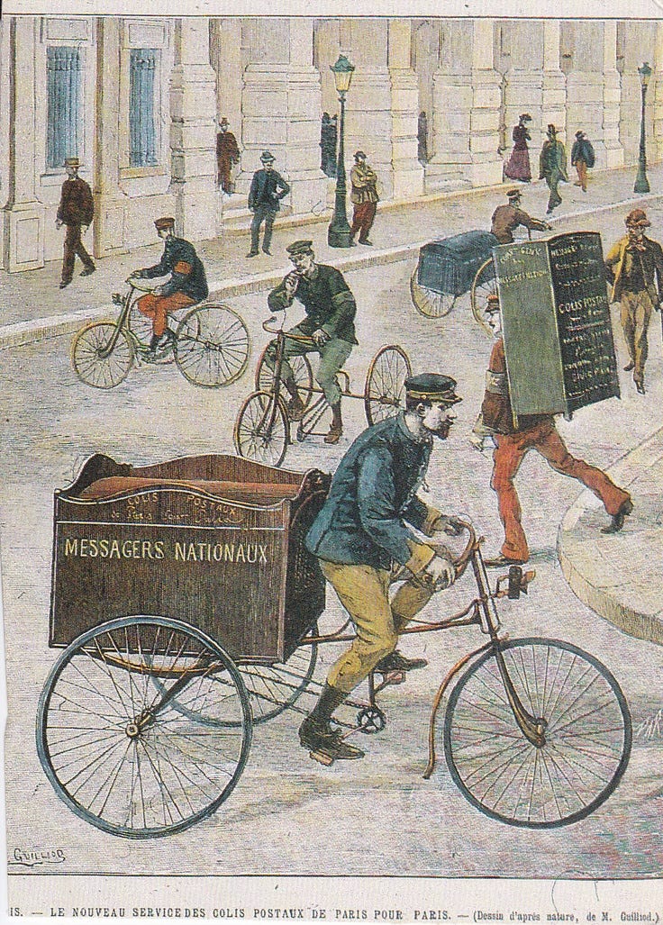 La Société utilisa d’abord des tricycles spéciaux, munis derrière le siège du facteur d’une boîte où les colis étaient enfermés. Ce mode de transport ne réussit pas ; ils étaient fatigants pour leurs conducteurs, onéreux comme prix d’achat, nécessitaient des réparations continuelles, la circulation était difficile et il fallait abandonner les colis dans la rue pendant la délivrance des colis dans les maisons.