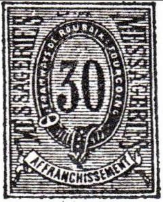 Les mêmes besoins ayant les mêmes effets, il y eut, en Province, des Compagnies qui se chargèrent du transport des petits colis. Pour faciliter la perception des frais de port de ces colis, elles créèrent des vignettes rappelant celles de Paris. Pour la période antérieure à 1900, nous ne connaissons actuellement qu’une émission de ce genre faite, vers 1860, par le Service des Messageries des Tramways allant de Roubaix à Tourcoing et vice-versa. Ces vignettes portent le chiffre de la valeur au centre d’un double ovale avec, en bas, le mot : « AFFRANCHISSEMENT » sur les côtés : « MESSAGERIES » et dans le double ovale «TRAMWAYS de ROUBAIX - TOURCOING ».”