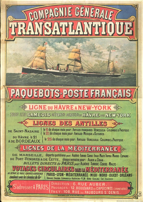 La période antérieure à 1890. La transmission rapide des colis de faible poids était une nécessité et le besoin créant l’organe, plusieurs sociétés se constituèrent dans ce but. (…) Ces sociétés apparurent en 1860. En effet le 16 décembre 1860, la Compagnie Générale Transatlantique, succédant à l’Union Maritime, avait obtenu la concession du service destiné à assurer le service postal entre la France et les Colonies.