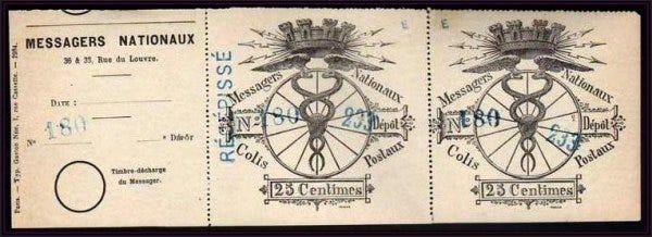 Le premier timbre est émis le 1er septembre 1890. Il s’agit d’un timbre de grande dimension représentant les deux serpents du caducée dans une roue de vélocipède ; la roue est accolée de deux ailes et surmontée d’une couronne murale d’où partent des foudres. Inscription : « Messagers Nationaux - N° Dépôt COLIS POSTAUX - 25 Centimes ». Ce timbre, typographié, était détaché d’un carnet qui comprenait, séparée par une dentelure, outre un timbre tout semblable portant le mot RÉCEPISSÉ pour être remis à l’expéditeur, une souche avec place pour les N° d’ordre, la date et le timbre-décharge du messager.
