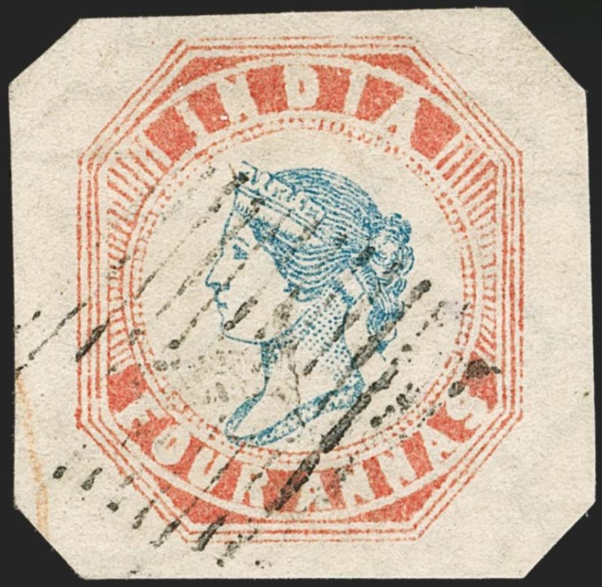 Cependant ni partout ni toujours l’Administration des Postes ne s’est montrée si parcimonieuse. On trouve des timbres avec de grandes marges - naturelles. Les premiers Pays-Bas, le n°1 de Norvège autour duquel on pourrait organiser un circuit auto- mobile, les premiers Portugais, les Maurice, etc. Mais le cas le plus typique est celui du four annas octogonal des Indes anglaises. Dans le premier tirage les timbres se présentent avec un intervalle de 18 mm. séparé au milieu par une ligne ondulée bleue. Or, vous ne pensez tout de même pas que les ciseaux de l’usager allaient suivre fidèlement cette ligne de séparation avec ce beau résultat d’avoir au moins 25 centimètres carrés de papier gommé à « lécher » et tout cela pour faire plaisir au philatéliste qui viendrait après lui cinquante ans plus tard. Alors que faisait-il ? Il débarrassait le timbre de tout ce superflu et il le coupait au ras du filet, en octogone, une forme sous laquelle il n’a aujourd’hui qu’une infime valeur. Sauf, bien entendu, le centre renversé dont il n’existe que quelques exemplaires au monde. (…)