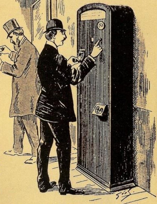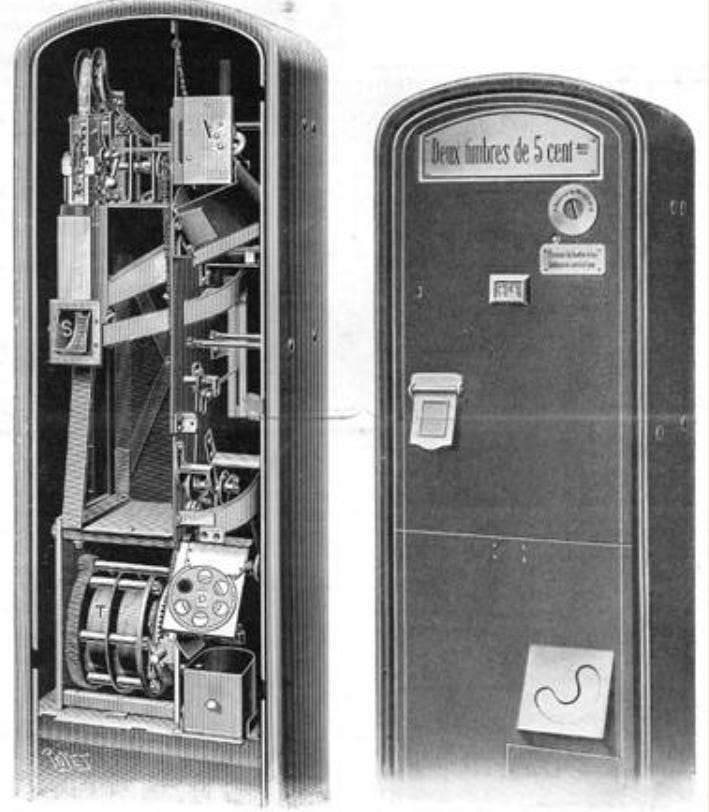 En France, l’expérience débute officiellement en mars 1908. Un bureau de poste s’équipe alors du premier distributeur automatique de timbres-poste. L’appareil, de marque Abel, est alimenté par des timbres conditionnés en rouleaux, enroulés autour d’un petit moyeu en carton.
