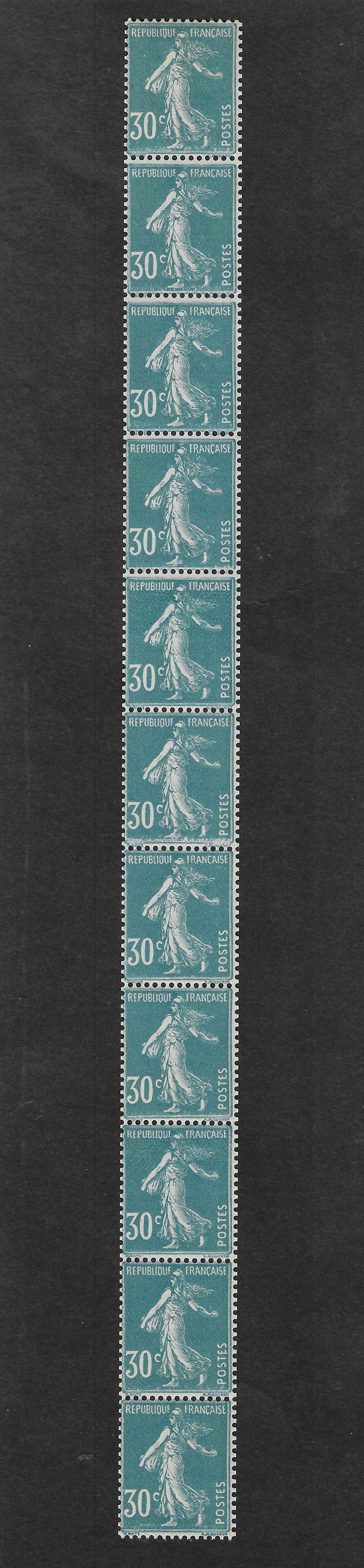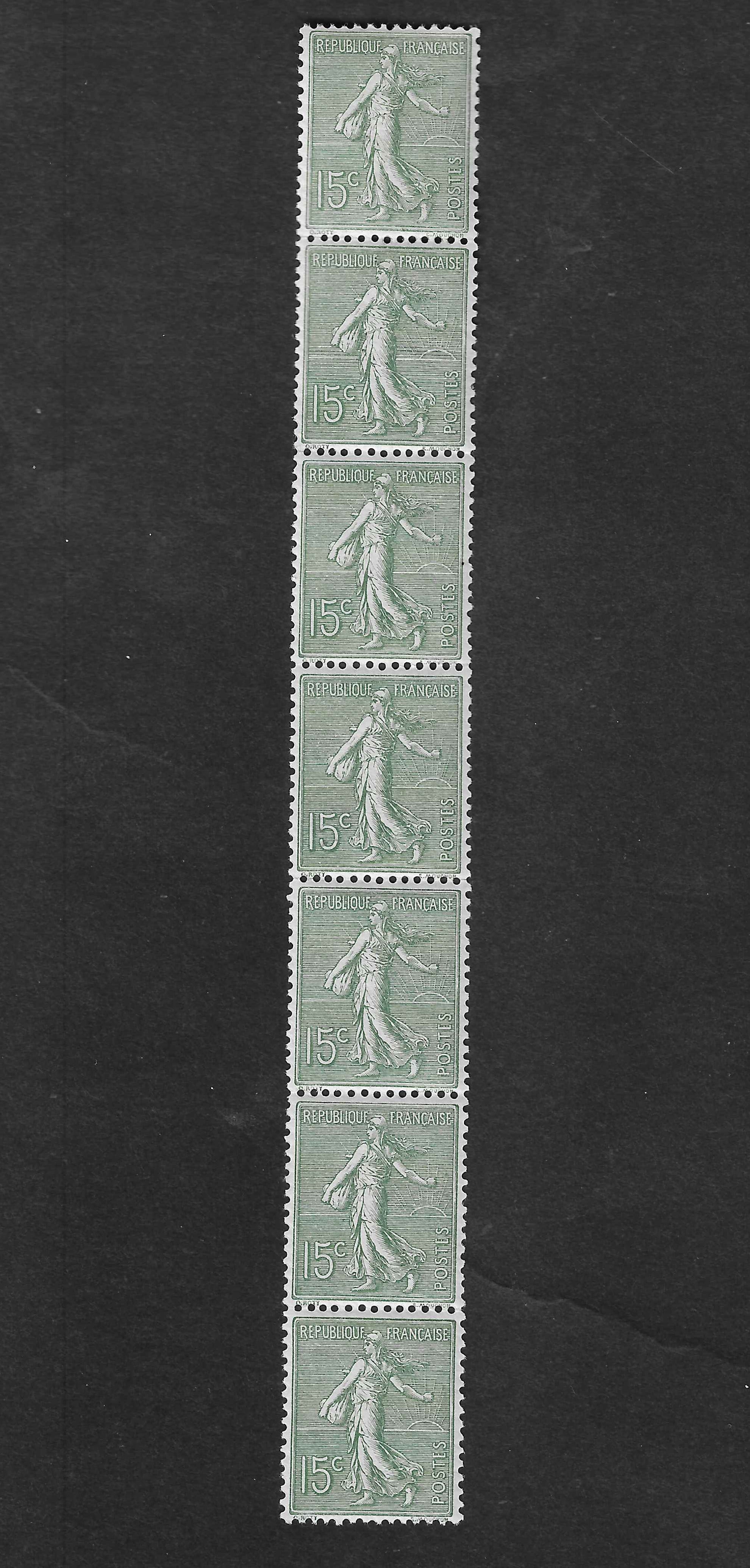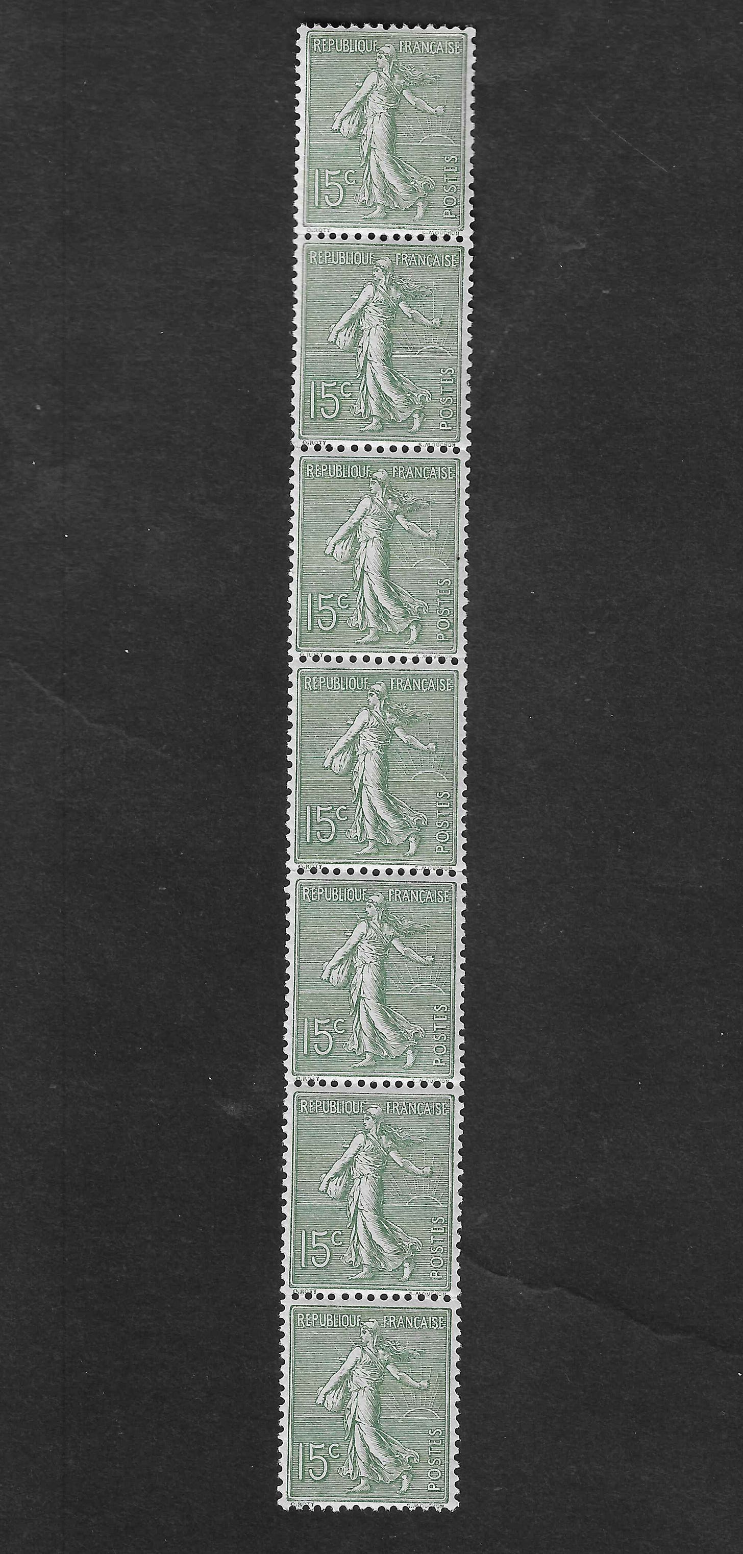 La photo illustrant la légende "Semeuse n°130c. Bande verticale de 6 exemplaires issue de roulette. Il s’agit de la bande la plus rare issue du tirage à plat. " m'interpelle puique cette bande de 6 comporte 7 timbres.