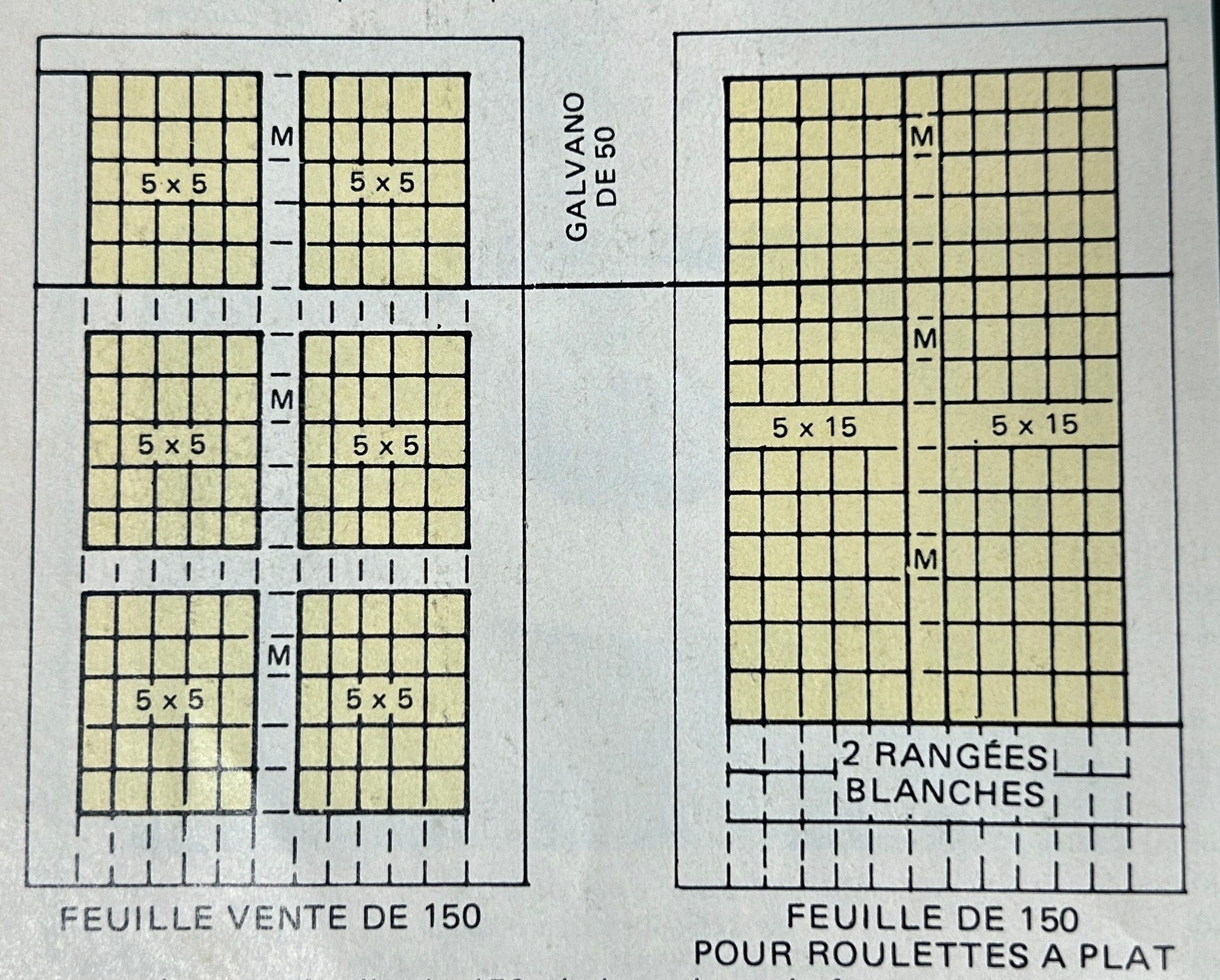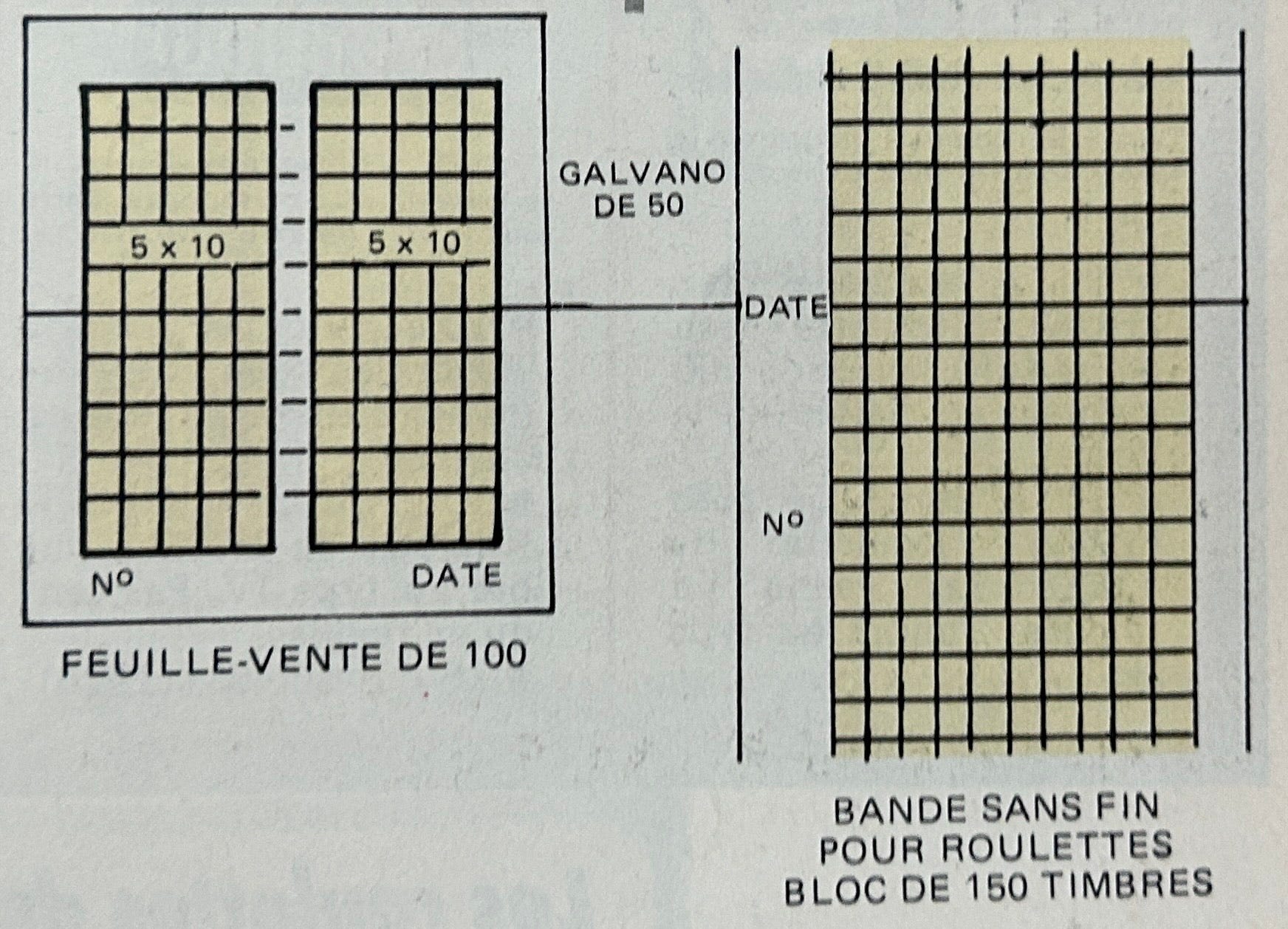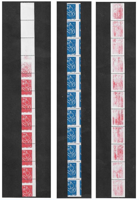 Concrètement, voici la solution trouvée pour l’administration postale : les timbres destinés aux roulettes sont imprimés en feuilles de 150 timbres, tout comme les timbres ordinaires, mais en supprimant les bandes interpanneaux horizontales. Chaque feuille destinée aux roulettes se compose ainsi de 10 bandes verticales de 15 timbres imprimés sans interruption.