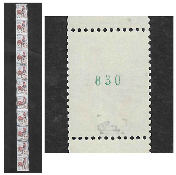 En 1962, une nouvelle étape est franchie avec le Coq de Decaris à 25 centimes. Identique aux timbres ordinaires au recto, il porte au verso un numéro de comptage, imprimé horizontalement tous les dix timbres, d’abord à l’encre verte (plus rare), puis à l’encre rouge pour cette émission et les suivantes.