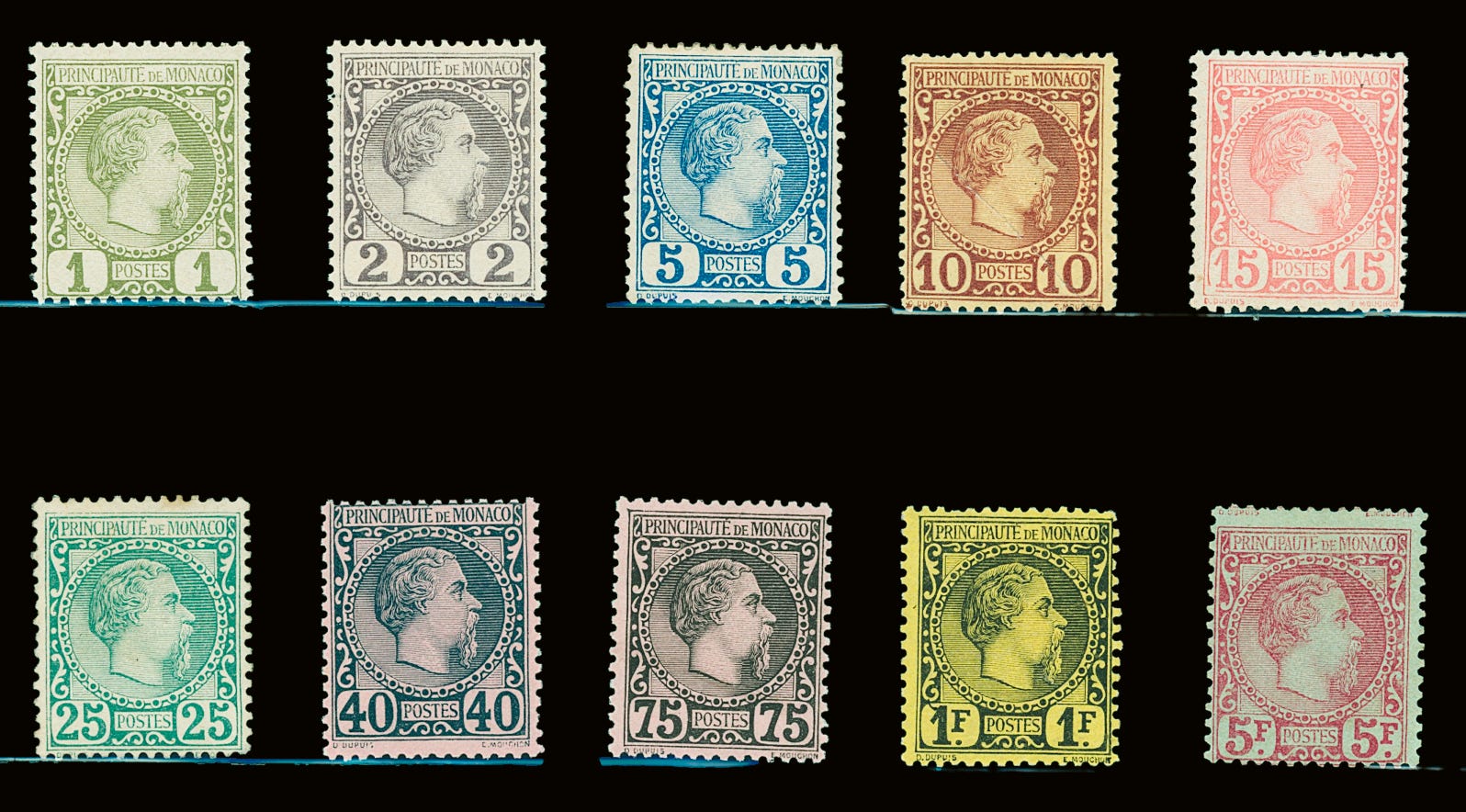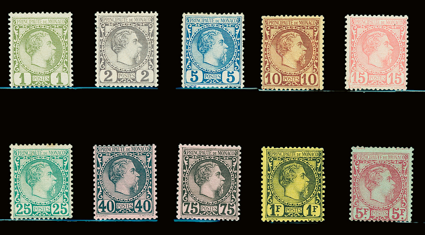 C’est le 9 septembre 1885 que la série complète fut mise en vente, et cette date doit être considérée comme la date exacte de l’émission pour les 1, 2, 10, 40 et 75 centimes, 1 franc et 5 francs. Les figurines françaises continuèrent à servir dans la Principauté mais devaient être retirées conformément à un accord qui eut lieu entre temps en le Gouvernement princier et le Ministre des postes et Télégraphes français. (…) La date prévue pour la suppression des timbres français dans les bureaux de la Principauté était le 1er janvier 1886, mais on la rapporta au 1er avril afin de laisser aux anciens approvisionnements le temps de s’épuiser. Sur les différents objets de correspondance mis à la poste à Monaco entre le 1er juillet 1885 et le 1er avril 1886 on trouve par conséquent différents affranchissements mixtes, qui constituent de précieuses curiosités dans les collections de timbres monégasques. (…)
