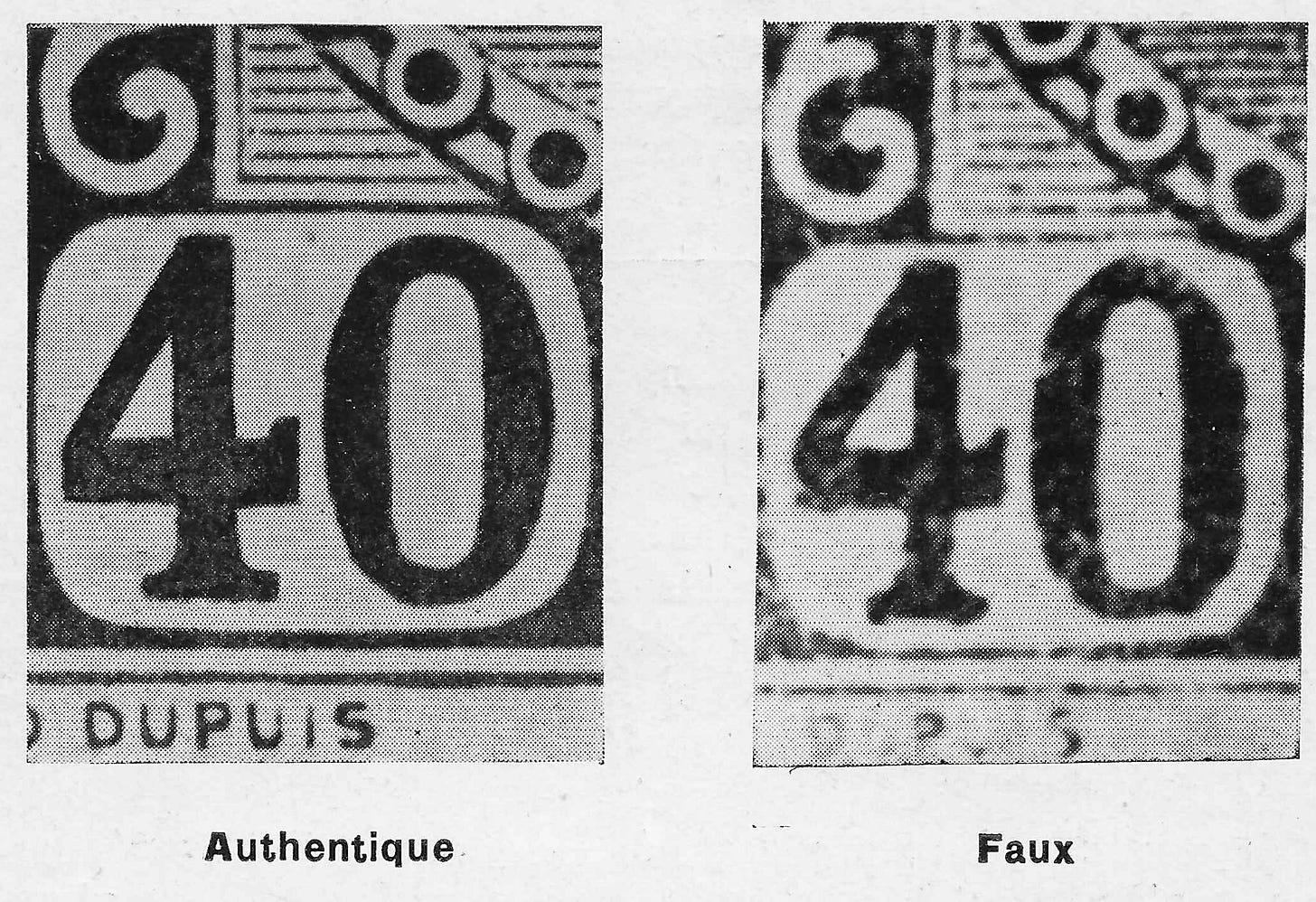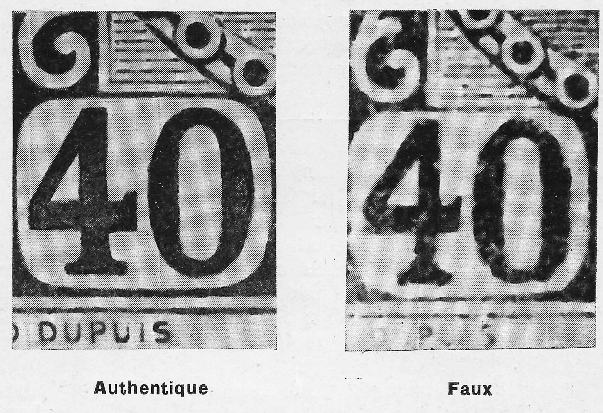Dans l’impression typographique, (…) les contours des parties colorées sont toujours tranchants. Dans l’impression photolithographique (…), les contours des parties colorées ne seront jamais tranchants. Ce sont les chiffres qui se prêtent le mieux à cette expertise. Nous reproduisons ici le chiffre agrandi d’un timbre original de 40 cts et celui d’un faux considéré comme très dangereux et obtenu par photolithographie. Ceux deux reproductions appuieront utilement nos explications.