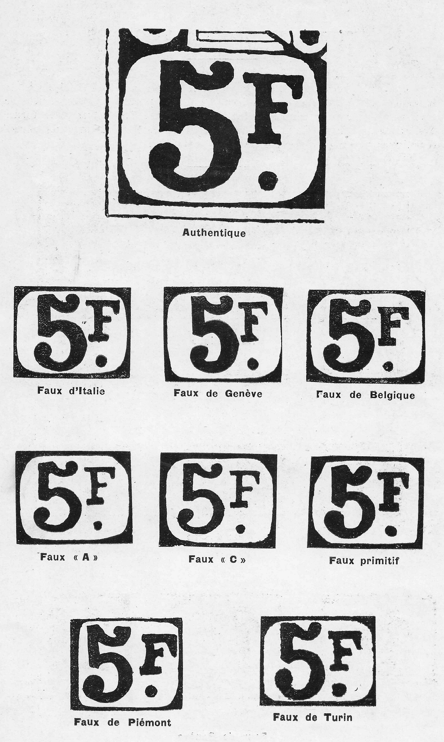 A propos des chiffres de valeur, nous avons constaté qu’ils constituaient généralement le meilleur repère pour l’identification des faux. Même les falsifications qui offrent des dessins parfaitement imités différent sensiblement des authentiques par le tracé des chiffres. (…) Ce phénomène s’explique mal. Quand le faussaire fait une reproduction photographique d’une pièce originale pour obtenir une imitation parfaite du dessin, les chiffres devraient être reproduits avec la même exactitude. Pourquoi donc les chiffres restent-ils le point faible, même dans les meilleures contrefaçons ? La seule explication que nous puissions donner à ce phénomène est la suivante : (…) pour obtenir un meilleur résultat quant à l’imitation des traits du dessin, les faussaires ont choisi pour la reproduction photographique une valeur dont la couleur convenait le mieux à l’opération. A notre avis, il doit s’agir du 1 fr. L’impression noire se détache bien du fond jaune clair. Pour obtenir des imitations des autres valeurs de la série, on se servit du même cliché en changeant seulement les chiffres, qui de ce fait ne sont pas identiques à ceux des originaux. Bien entendu, ce n’est qu’une hypothèse.