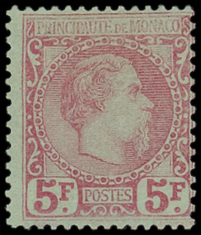 La plus grosse valeur de la série était destinée - comme le 1 fr. - à l’affranchissement des plis lourds et des envois avec valeur déclarée, surtout à destination des Etats-Unis. Elle fut très peu employée et est devenu par conséquent non seulement le timbre le plus rare de Monaco, mais une des principales vedettes parmi les timbres classiques d’Europe.