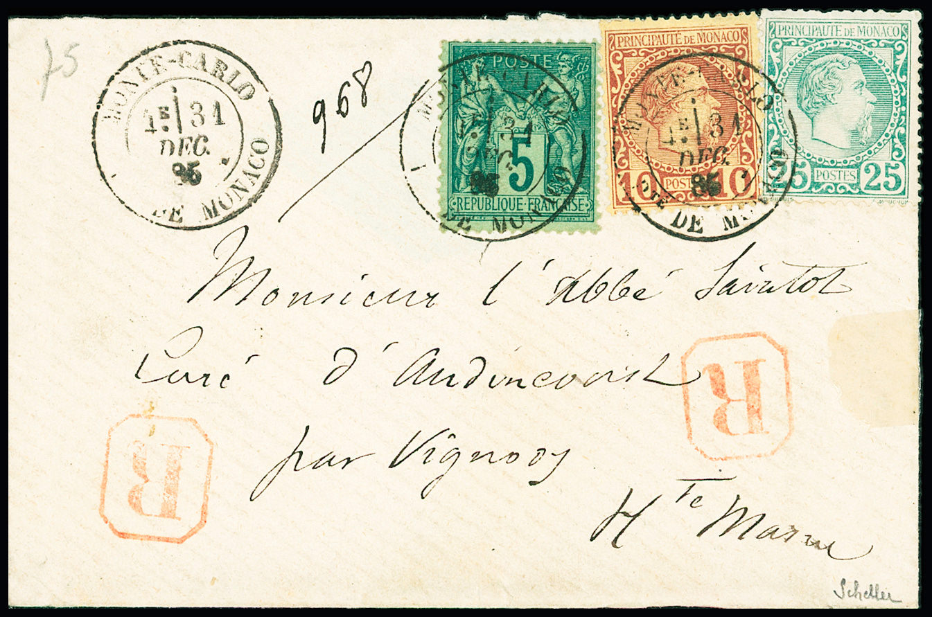 Par contre, on ne connaît pas d’affranchissements mixtes, timbres sardes et français sur le même pli. Ce qui prouve qu’à l’arrivée des timbres français on avait immédiatement mis hors cours les figurines sardes. Cette situation de fait ne fut légalisée que cinq ans plus tard ! Dans le cadre d’une convention que la Principauté conclut avec le gouvernement français en date du 9 novembre 1865, on régla enfin du point de vue juridique les relations postales des deux pays. (…)