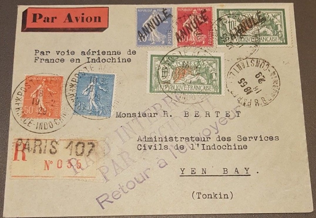 « En février 1929, l'aviateur Costes devait, avec l'avion « Le Dragon d'Annam », effectuer une liaison aérienne avec l’Indochine. Il avait été prévu que les plis transportés seraient oblitérés avec un cachet spécial portant les mots : Poste aérienne France-Indochine. Ils devaient être centralisés sans avoir été oblitérés. Mais quelques bureaux, oubliant cette prescription, apposèrent les cachets à date ordinaires sur les timbres. Au moment de l'apposition du cachet prévu, on s'aperçut de cette erreur. Les expéditeurs avaient droit au cachet particulier qui pouvait donner une plus-value à leurs envois. L'Administration donna alors l'ordre d'employer un moyen de fortune pour régulariser les expéditions. On supprima l'affranchissement primitif en apposant, à la main, le cachet ANNULÉ sur les timbres déjà oblitérés, et l'on affranchit à nouveau les plis avec d’autres figurines qui reçurent le cachet officiel.