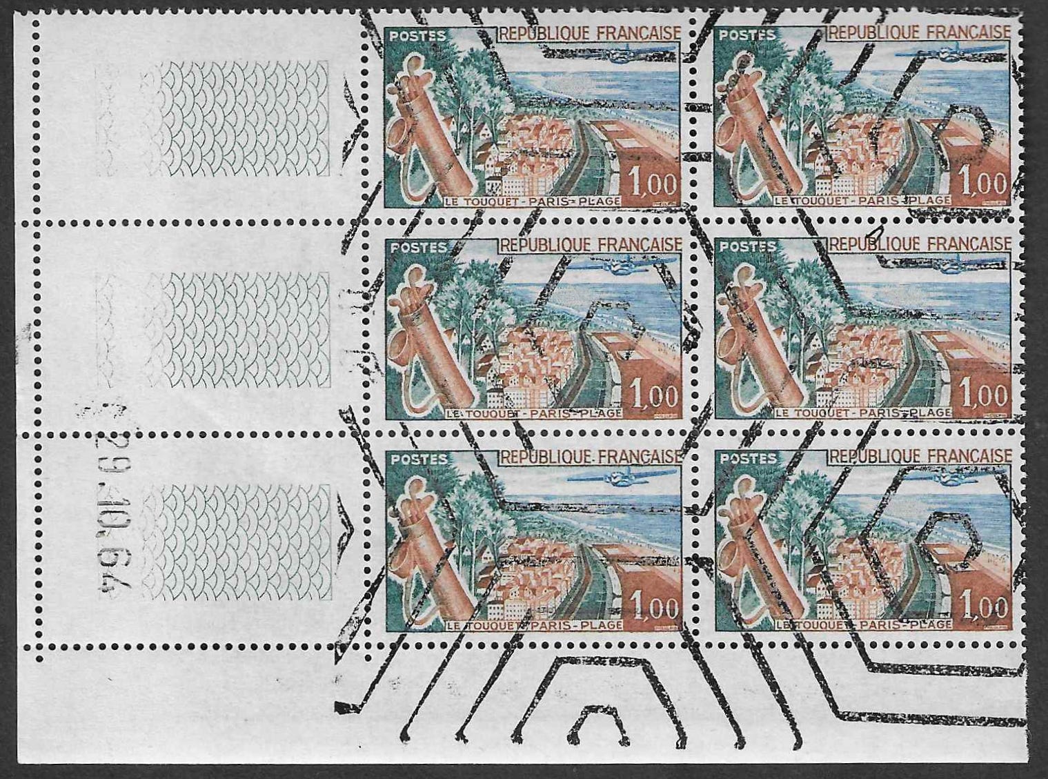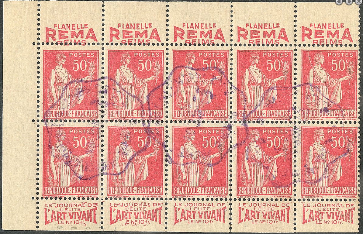 La première de ces estampilles signalée à l’attention des collectionneurs était apposée sur un bloc du 10 c. rouge Semeuse camée au moyen d'une roulette qui répétait sans fin sur deux lignes parallèles disposées tête-bêche, le mot SEINE en lettres capitales de 5 min.
