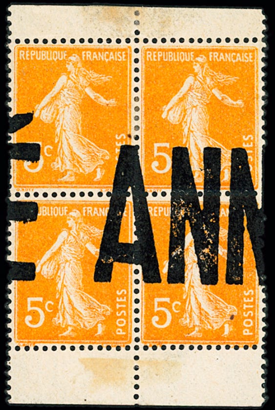 Surcharges ANNULÉ diverses. Il existe d'autres modèles de surcharges annulatives que l'on rencontre plus rarement que les hexagones et qui semblent être les premiers essais d'empreintes confectionnées pour mettre le plus rapidement possible hors service les feuilles rebutées. La grandeur des lettres employées pour en composer l'inscription (ANNULE) en fait foi. Ce mot dont les lettres mesuraient de 9 mm. à 40 mm. était imprimé soit au cachet- tampon soit au rouleau. (…)