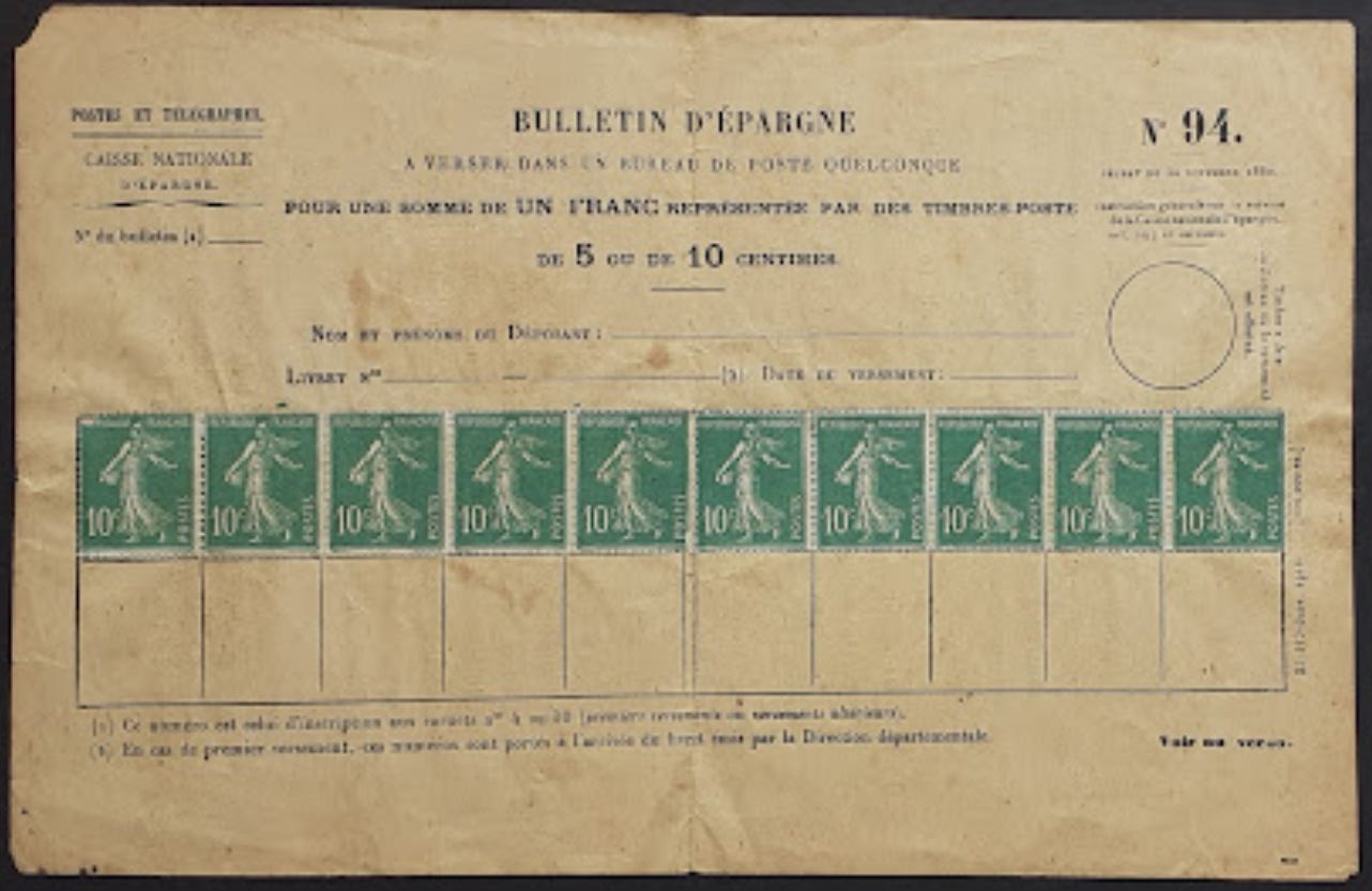 Des recherches personnelles nous permettent aujourd’hui d'apporter à ces renseignements des précisions complémentaires. Ce système de versements en timbres-poste par bulletins d'épargne fut créé en 1882 par une loi du 10 juin de la même année qui permettait d'autoriser par décret la Caisse nationale d'épargne à recevoir des versements inférieurs à 1 fr. En vertu de cette loi un décret du 30 novembre suivant autorisait de faire ces versements en timbres-poste sur bulletins d'épargne, à partir du 1er octobre. D'où ces bulletins scolaires que les instituteurs garnissaient pour les jeunes écoliers. Ces bulletins étaient déposés dans n'importe quel bureau de poste, à charge du receveur de les transmettre à la succursale départementale de la C.N.E.