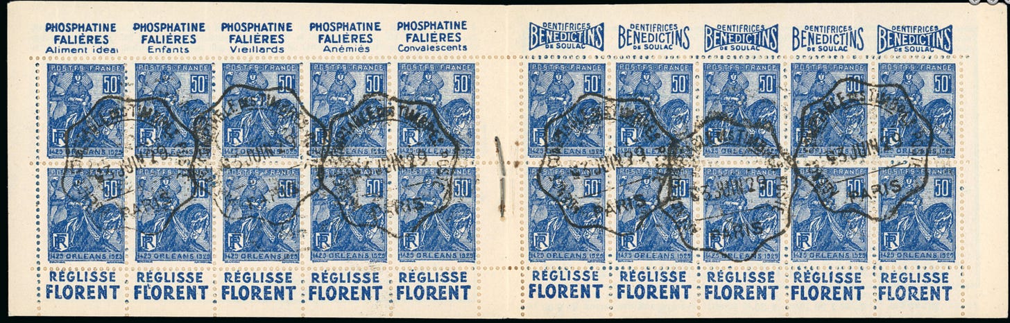 En 1922, la publicité sur les carnets de timbres-poste fut accordée à un concessionnaire, M. Carlos Courmont, qui imprimait lui-même les couvertures publicitaires. Celui-ci, après entente avec l'Administration des Postes, édita un certain nombre de carnets spéciaux qu'il adressa à titre d'échantillon à des groupements industriels ou commerciaux importants. (…)